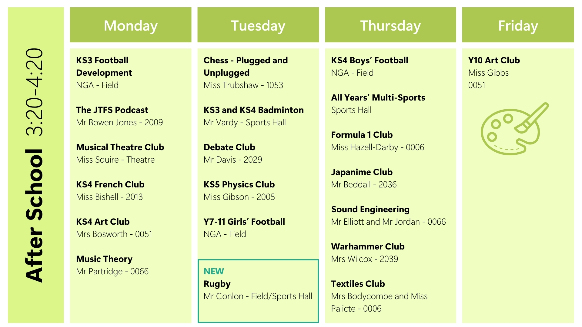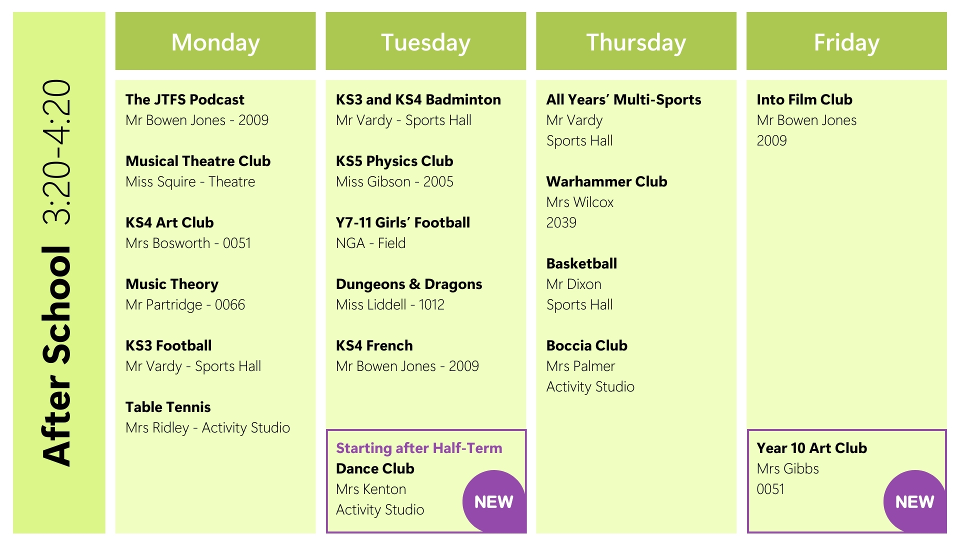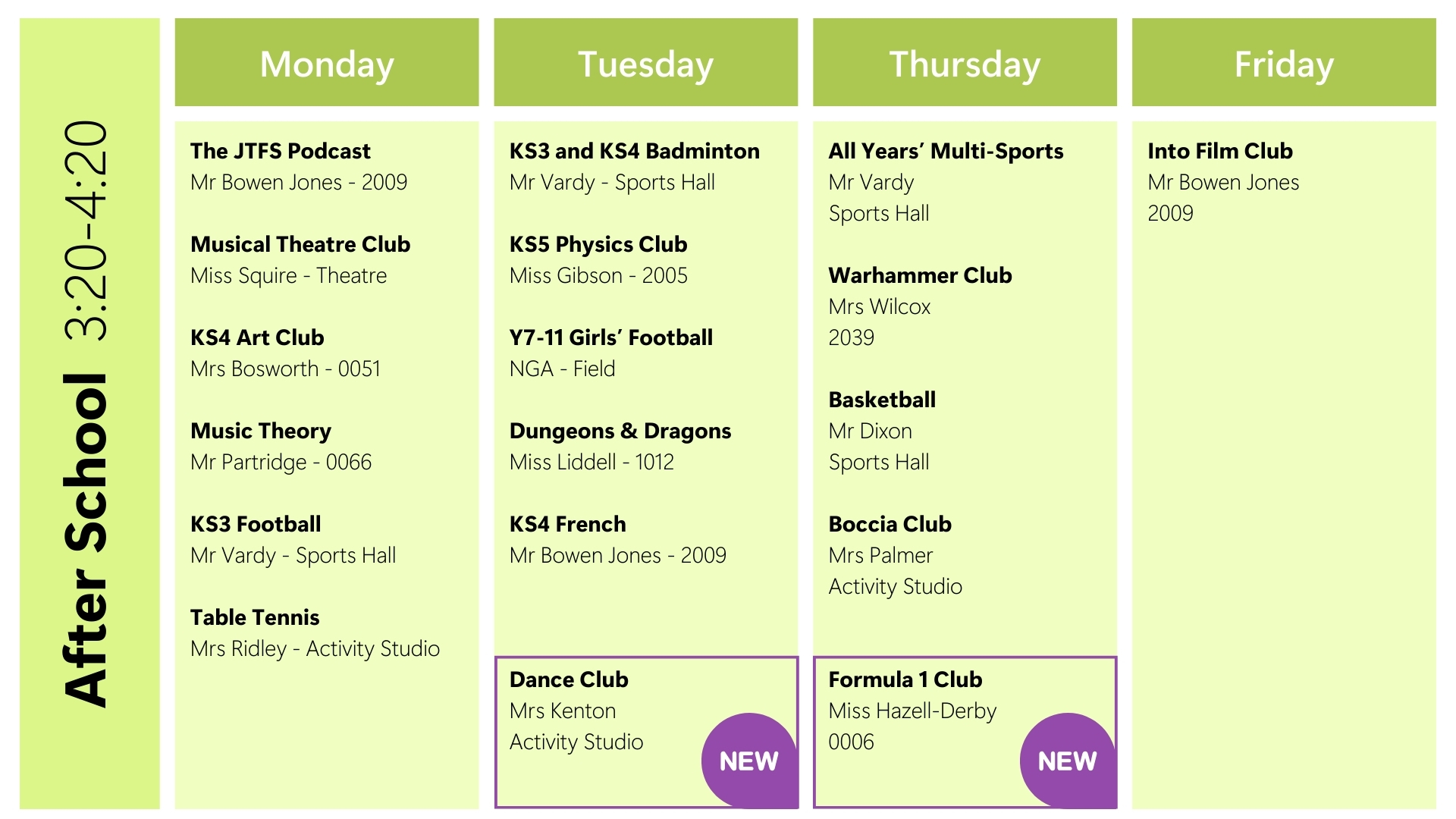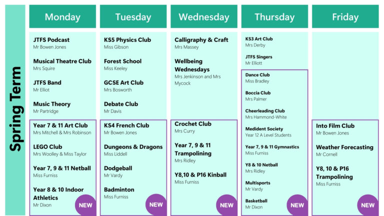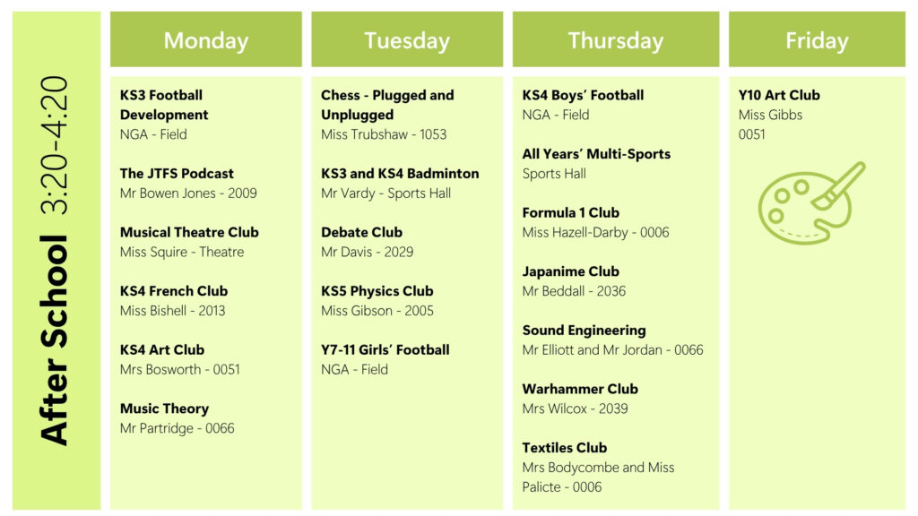 One element of Enrichment that we are extremely proud of is our wraparound enrichment programme. At JTFS we offer an extensive termly programme of activities which take place before and after school, as well as at lunchtime. All students are encouraged to take part in at least one activity per week, with the main aim of providing opportunities and experiences beyond the confines of the traditional classroom. The Enrichment activity timetable is updated on a termly basis so that everyone has a chance to participate in a range of sessions. We encourage students to have an input into what they would like the curriculum to look like and are proud to announce that we have actioned every request to date. Our students are encouraged to try new things, be adventurous and persevere with a new challenges!
