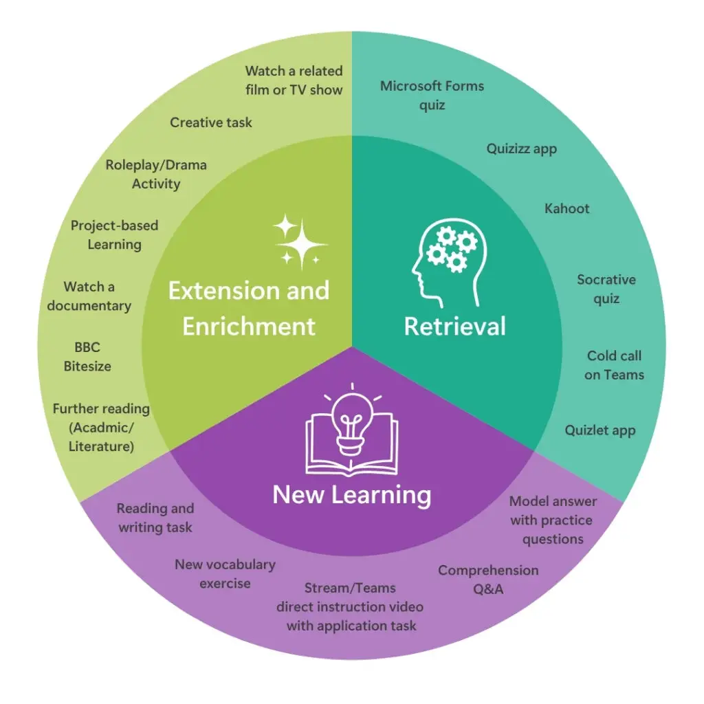 The documents below provide an overview of our intentions and expectations. Our remote learning lessons are planned around three core concepts, retrieval, new learning, and enrichment. This means that there will be broadly three sections to the work – retrieval practice which consolidates prior learning; new content and an optional enrichment element which is related material to broaden or deepen thinking around the subject, driving question, year 9 learning focus or GCSE content.